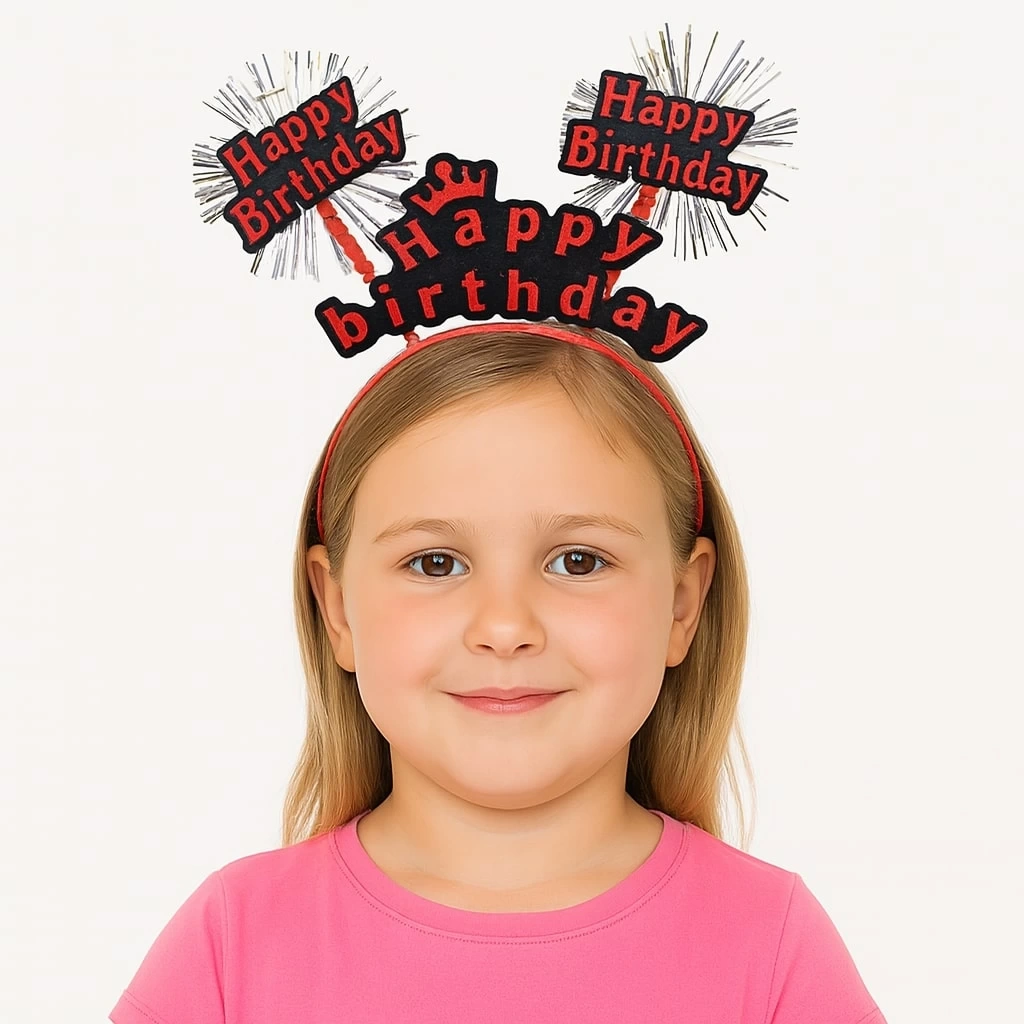 Doğum günü partilerini renklendirecek bu KIRMIZI Happy Birthday yazılı taç, çocukların kutlamalarında eğlenceli ve şık bir görünüm sunar. Parlak kırmızı detayları, ışıldayan yıldız patlaması figürleri ve esnek yapısı ile hem kız hem de erkek çocuklar için uygundur.